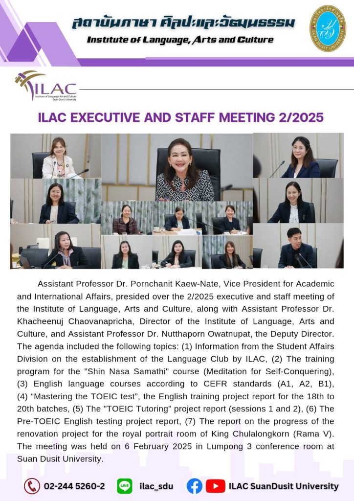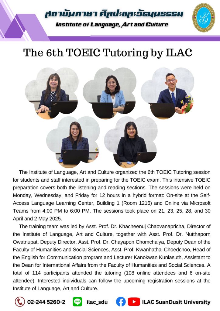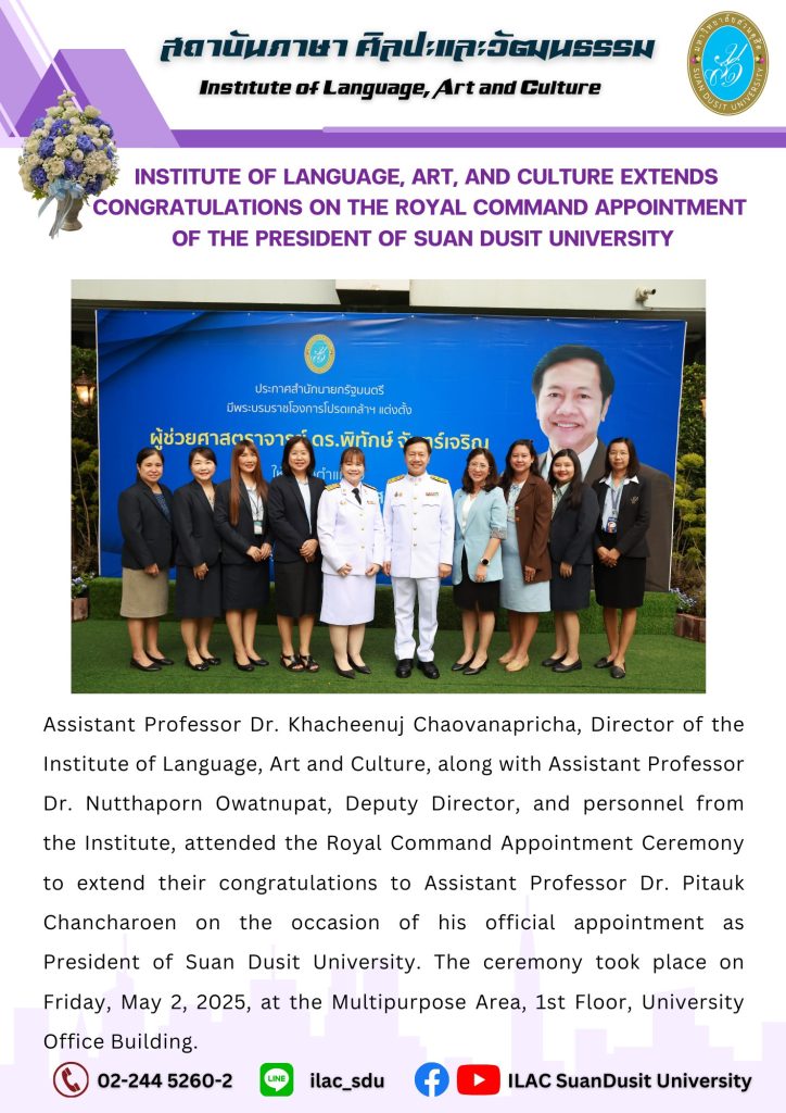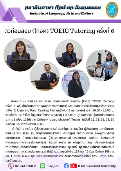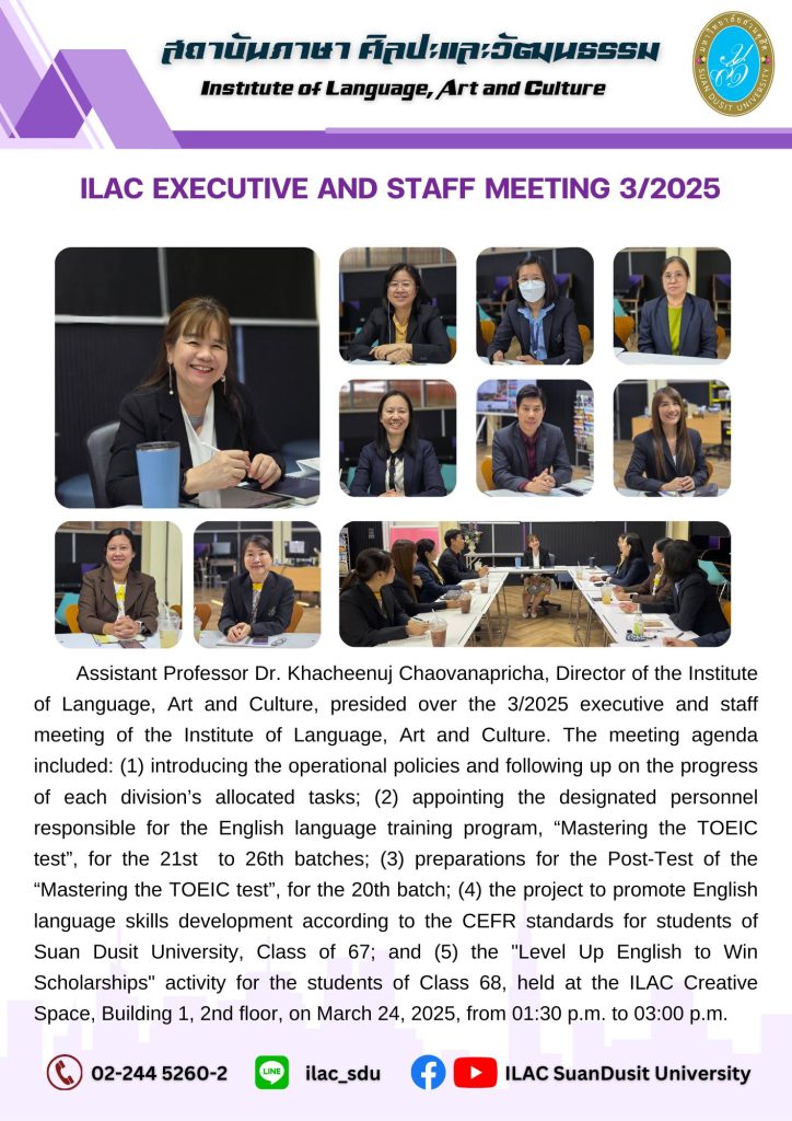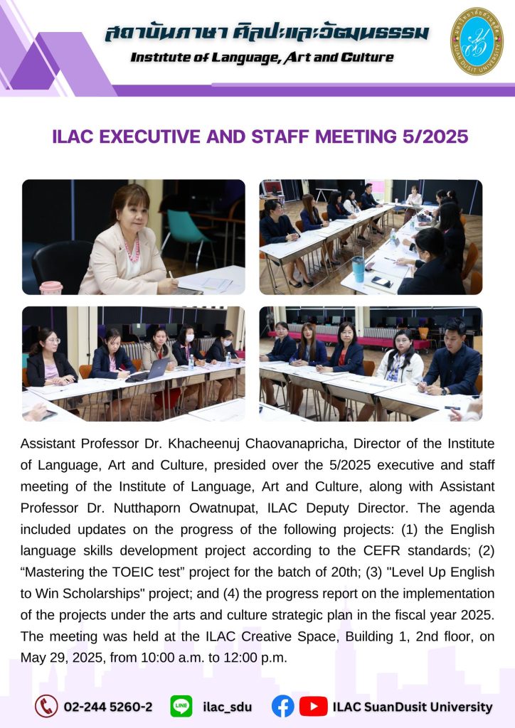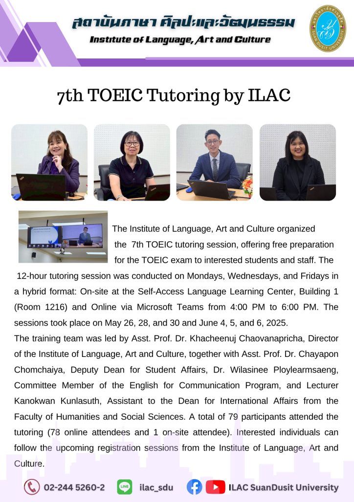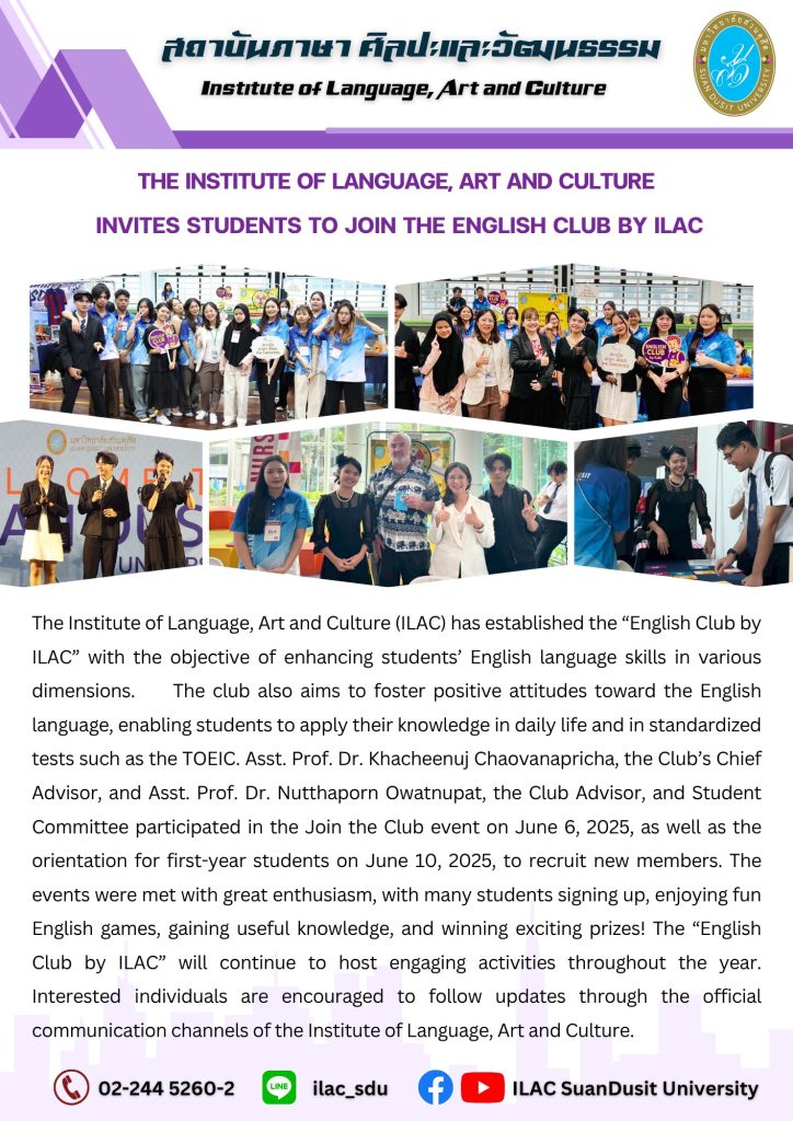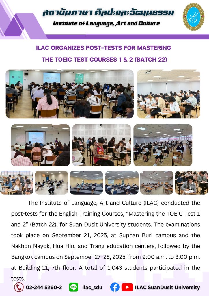 สถาบันภาษา ศิลปะและวัฒนธรรม จัดกิจกรรม “ILAC English Smart” ณ มหาวิทยาลัยสวนดุสิต กรุงเทพมหานคร นำโดยผู้ช่วยศาสตราจารย์…