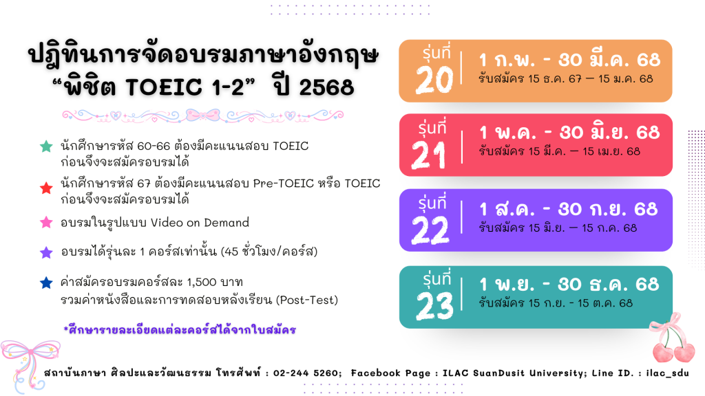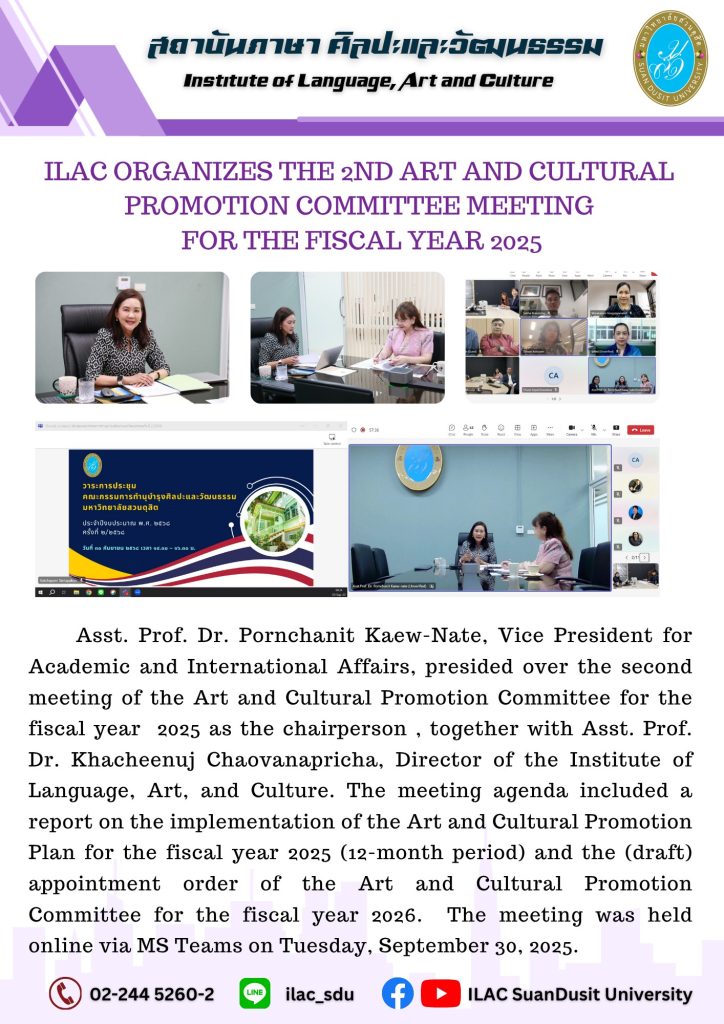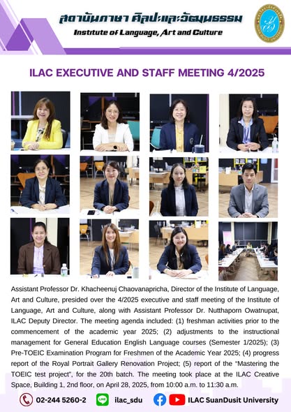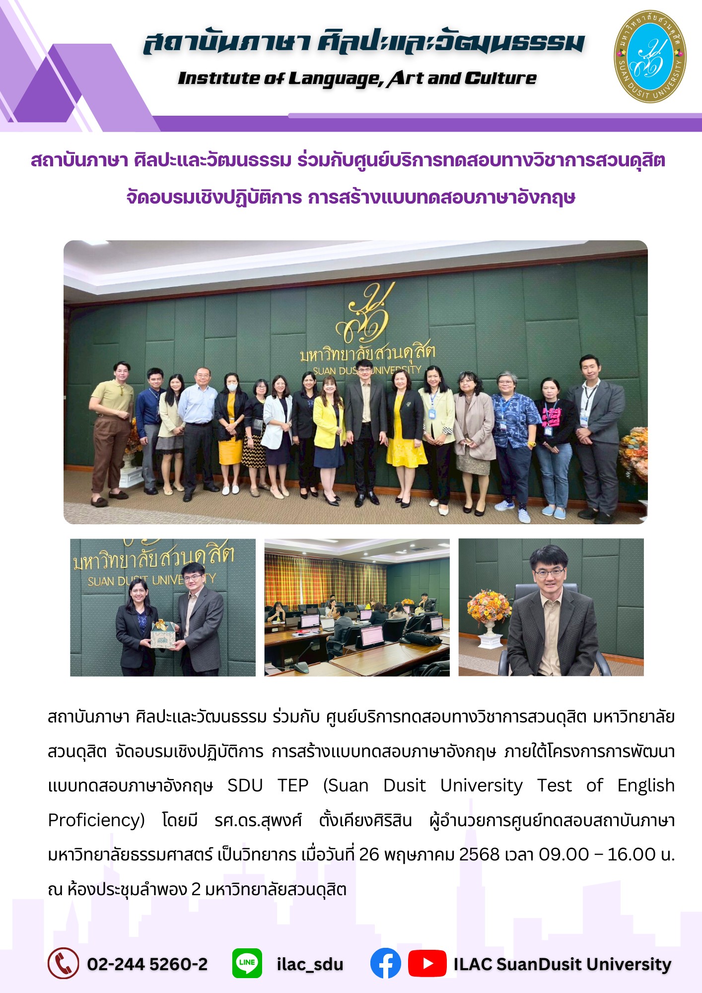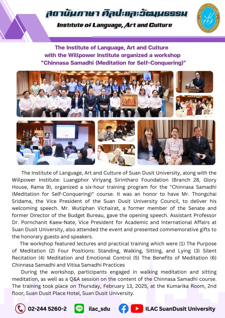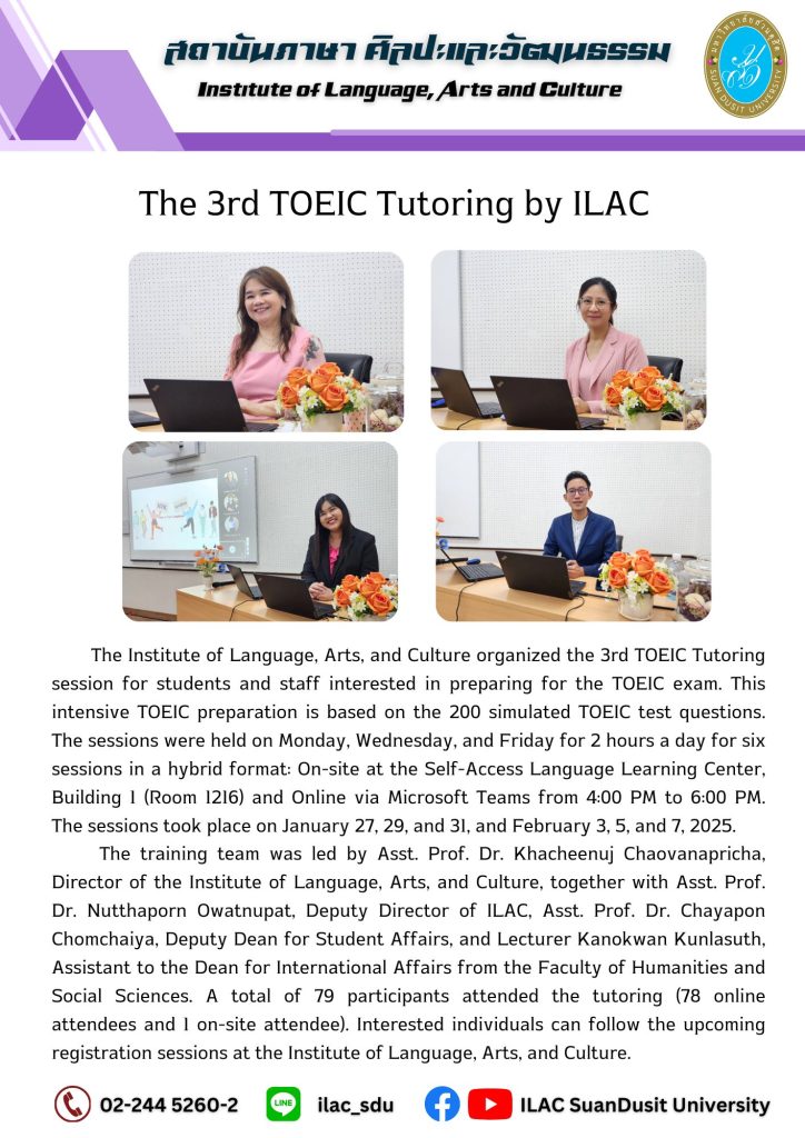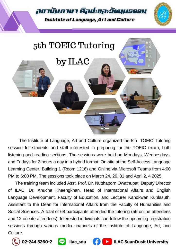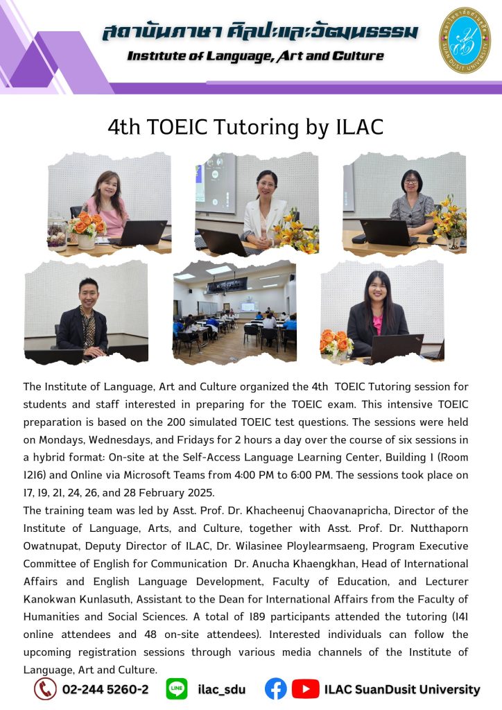 สถาบันภาษา ศิลปะและวัฒนธรรม จัดกิจกรรม “ILAC English Smart” ณ มหาวิทยาลัยสวนดุสิต กรุงเทพมหานคร นำโดยผู้ช่วยศาสตราจารย์…
