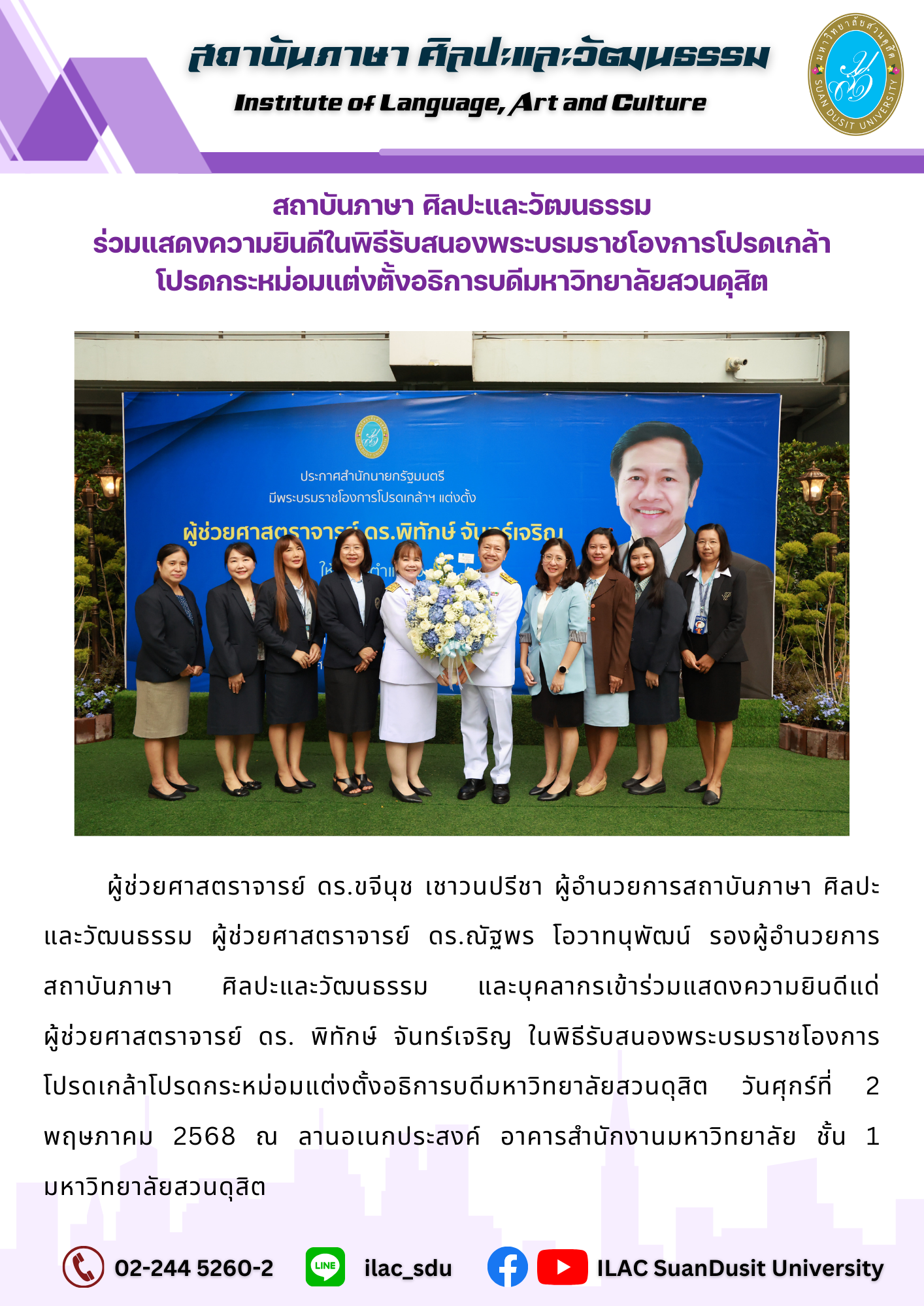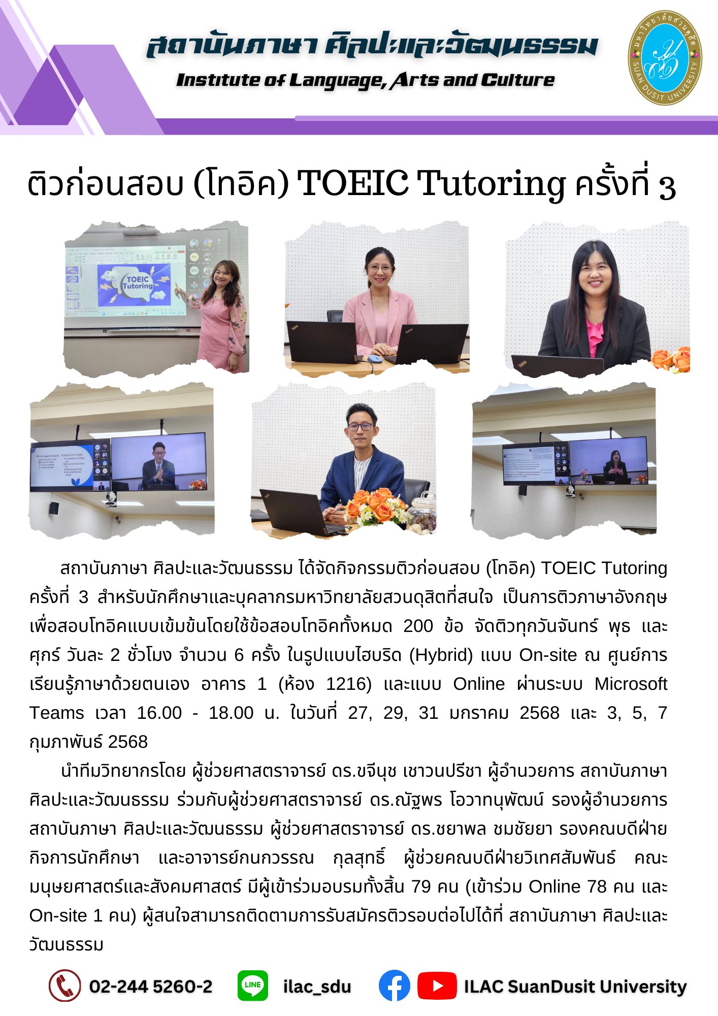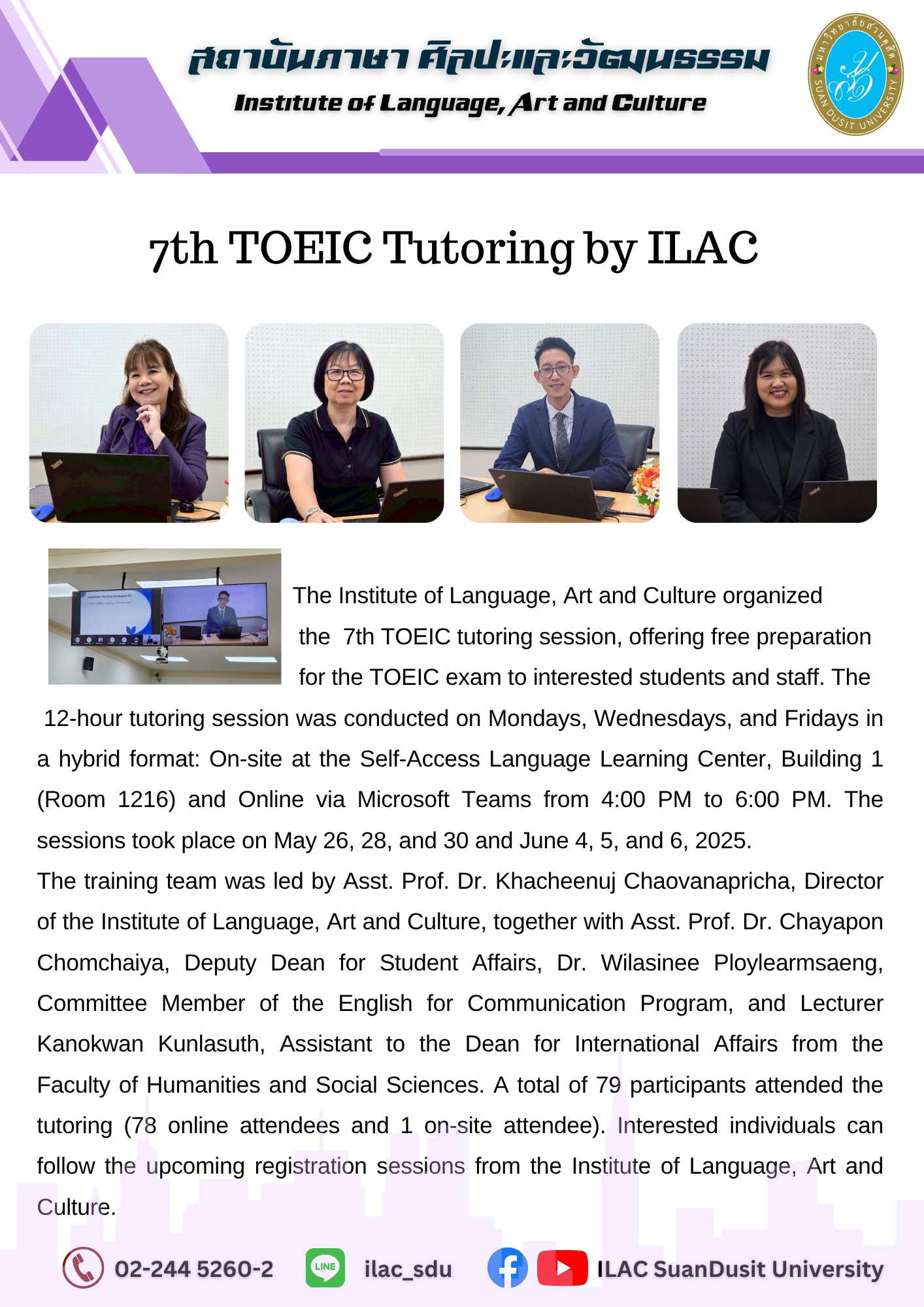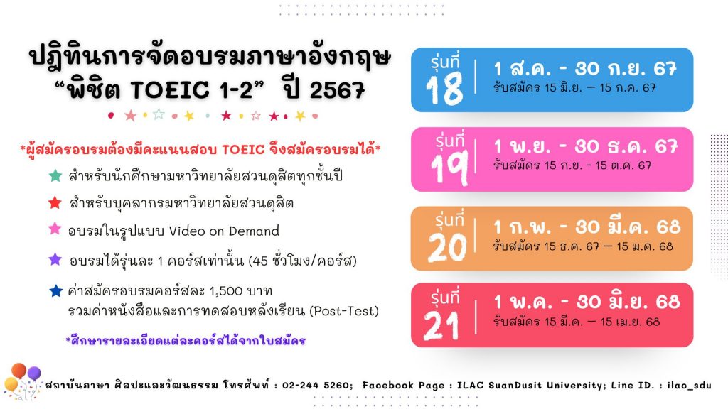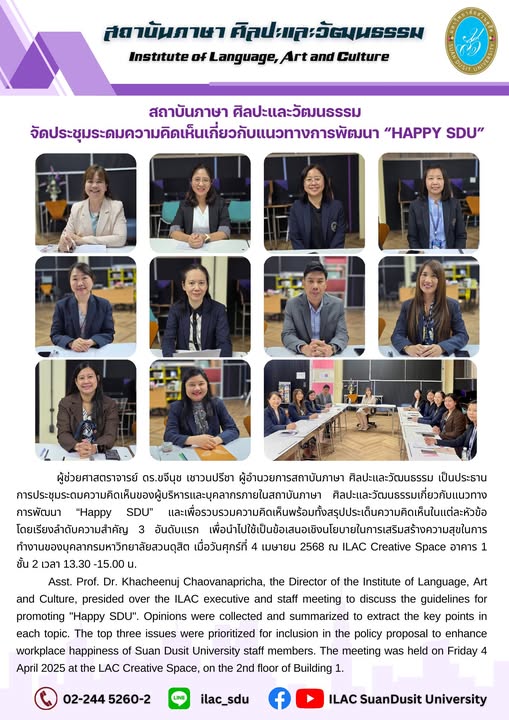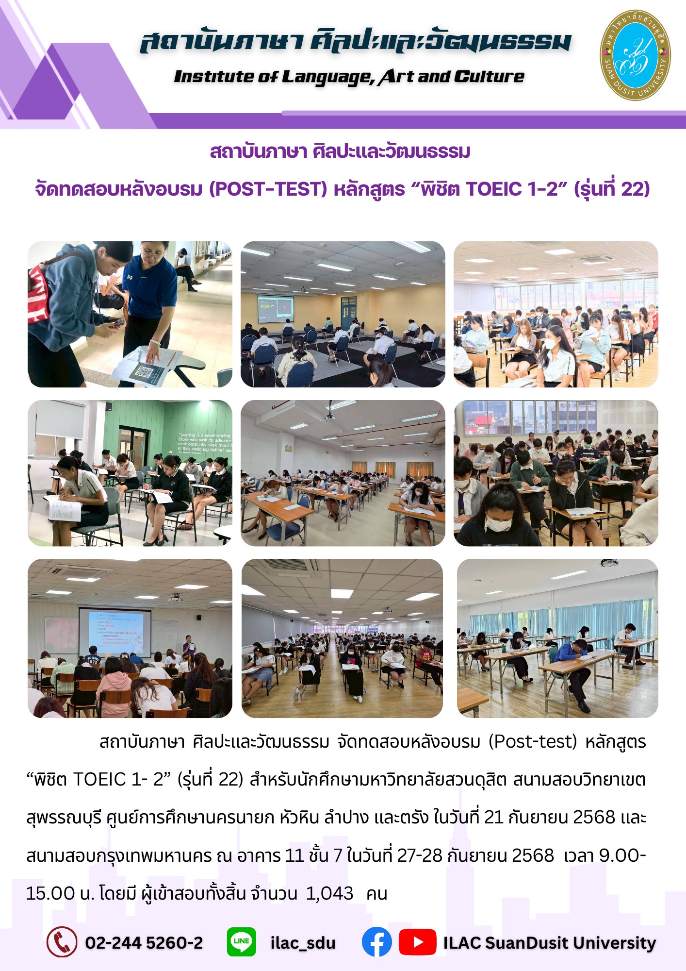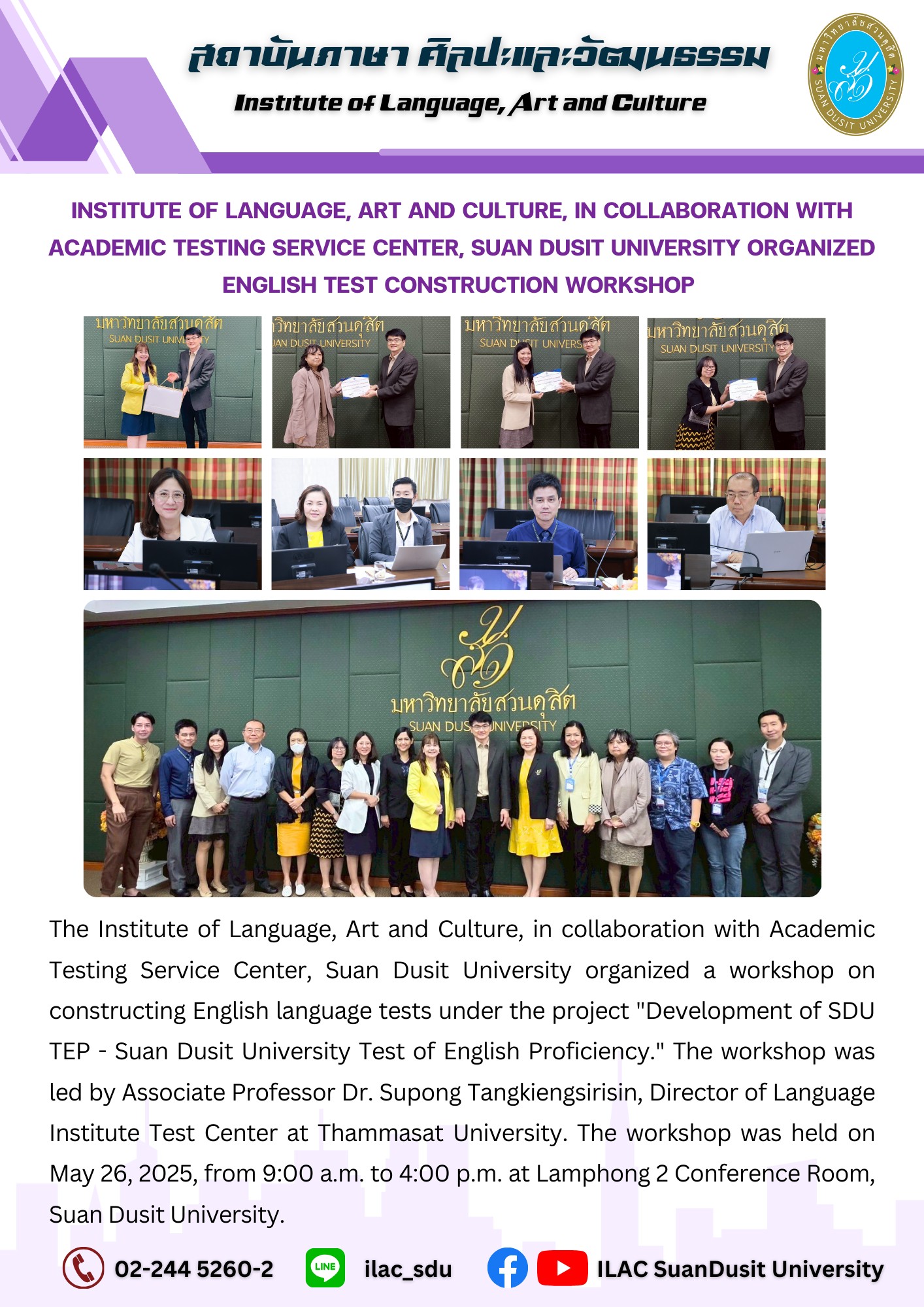 สถาบันภาษา ศิลปะและวัฒนธรรม จัดกิจกรรม “ILAC English Smart” ณ มหาวิทยาลัยสวนดุสิต กรุงเทพมหานคร นำโดยผู้ช่วยศาสตราจารย์…