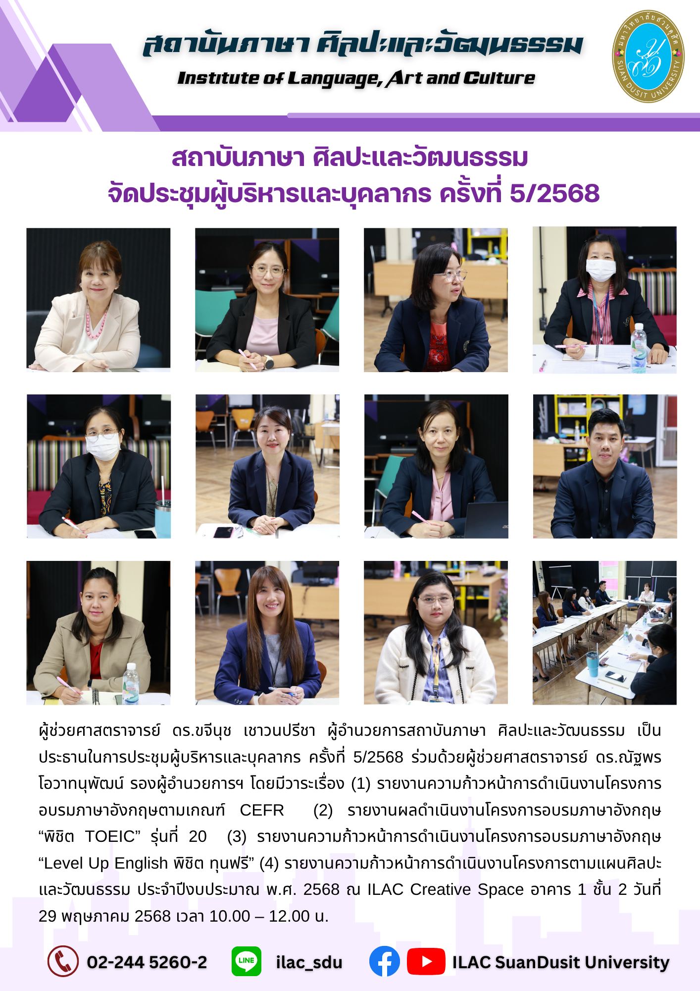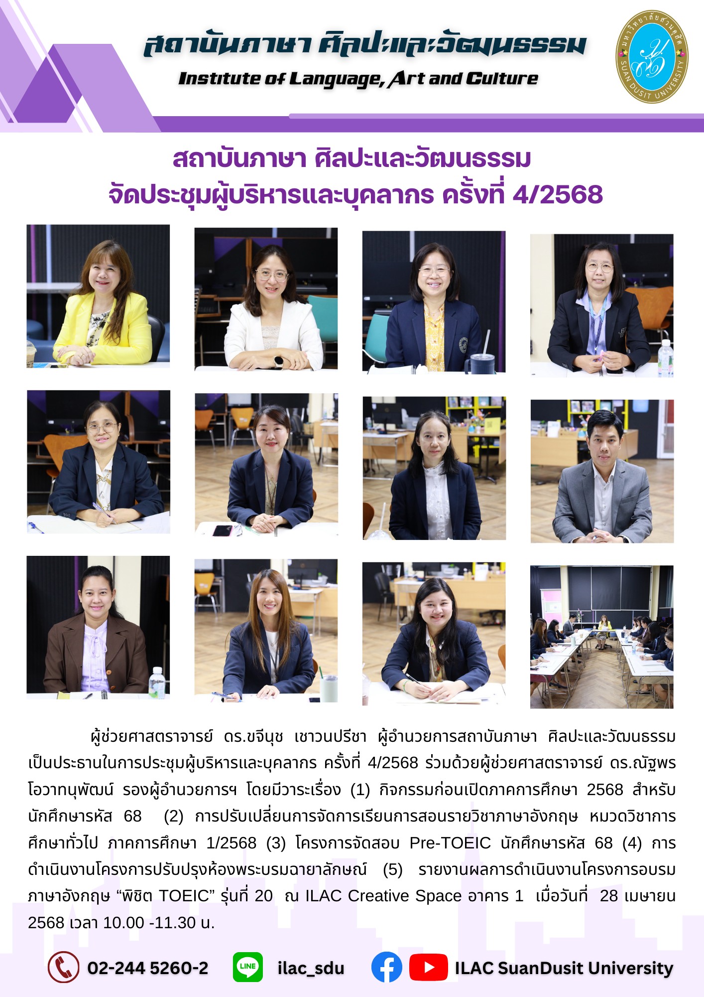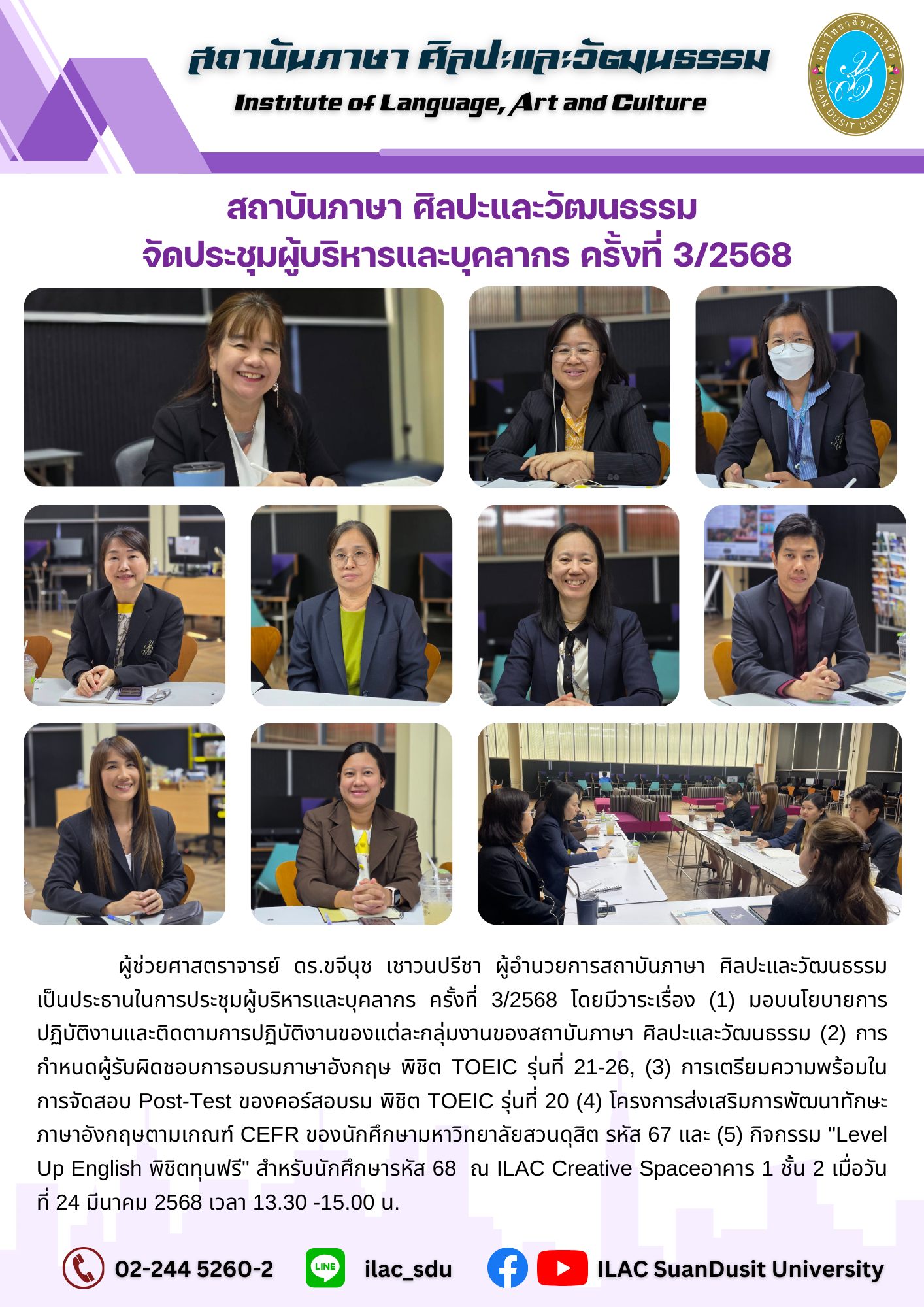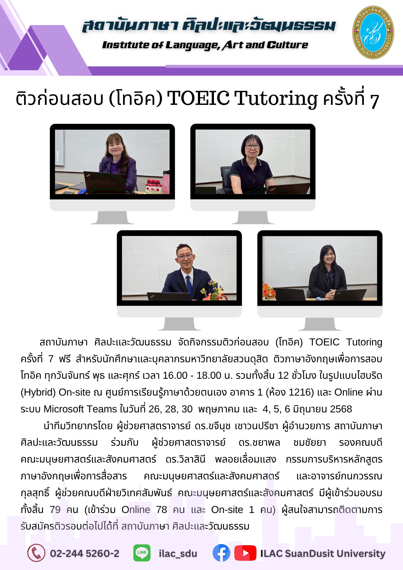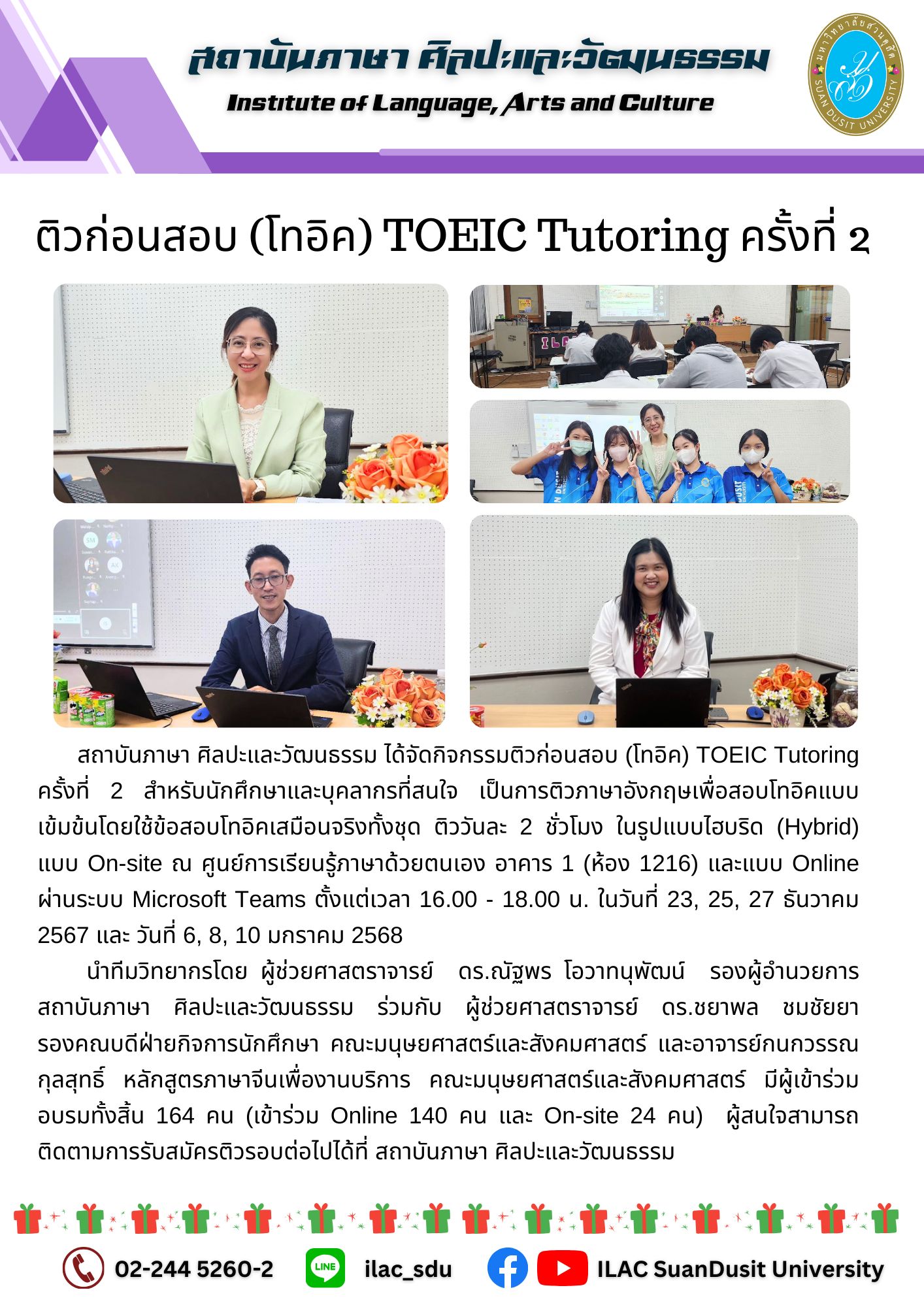 สถาบันภาษา ศิลปะและวัฒนธรรม จัดกิจกรรม “ILAC English Smart” ณ มหาวิทยาลัยสวนดุสิต กรุงเทพมหานคร นำโดยผู้ช่วยศาสตราจารย์…