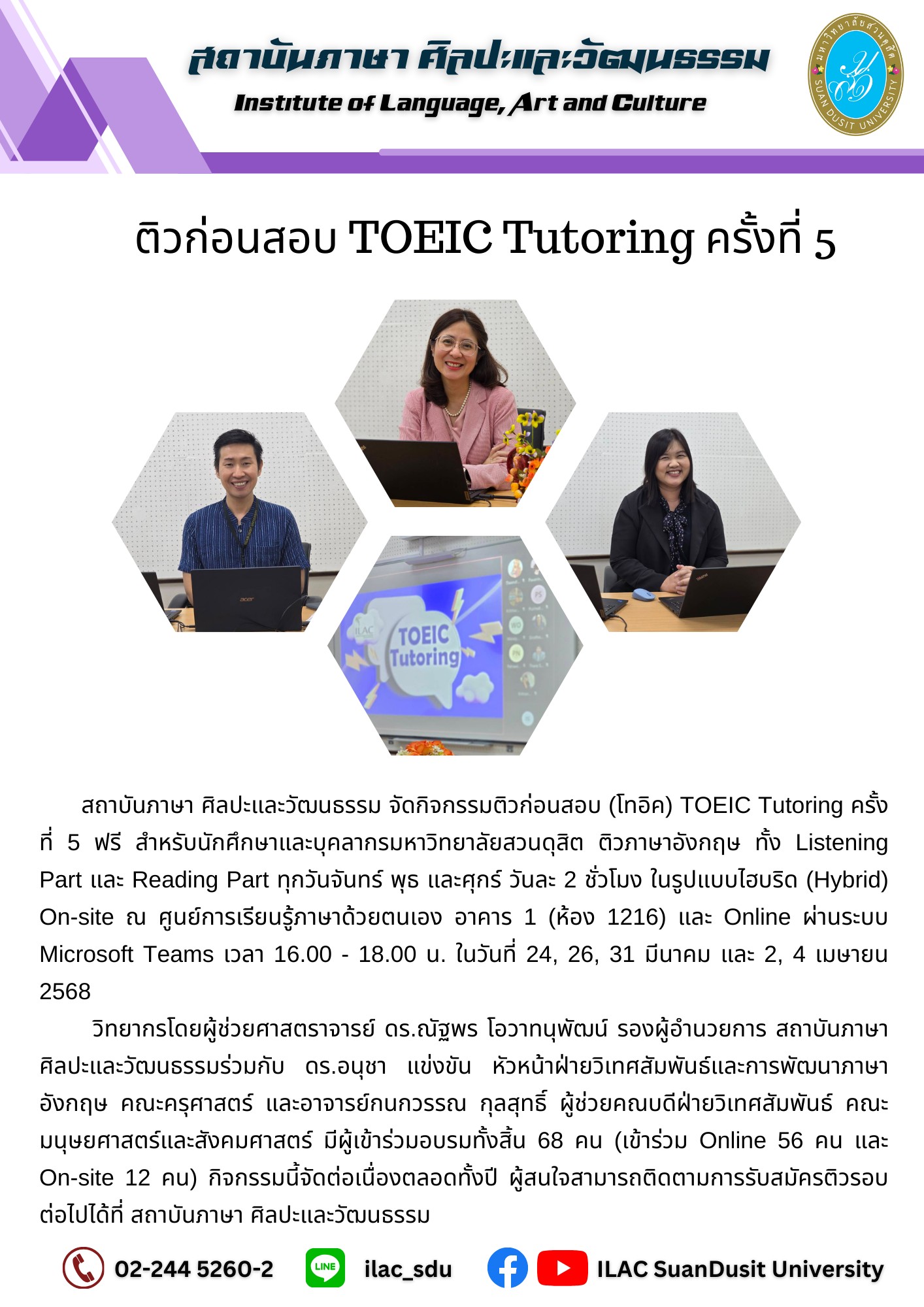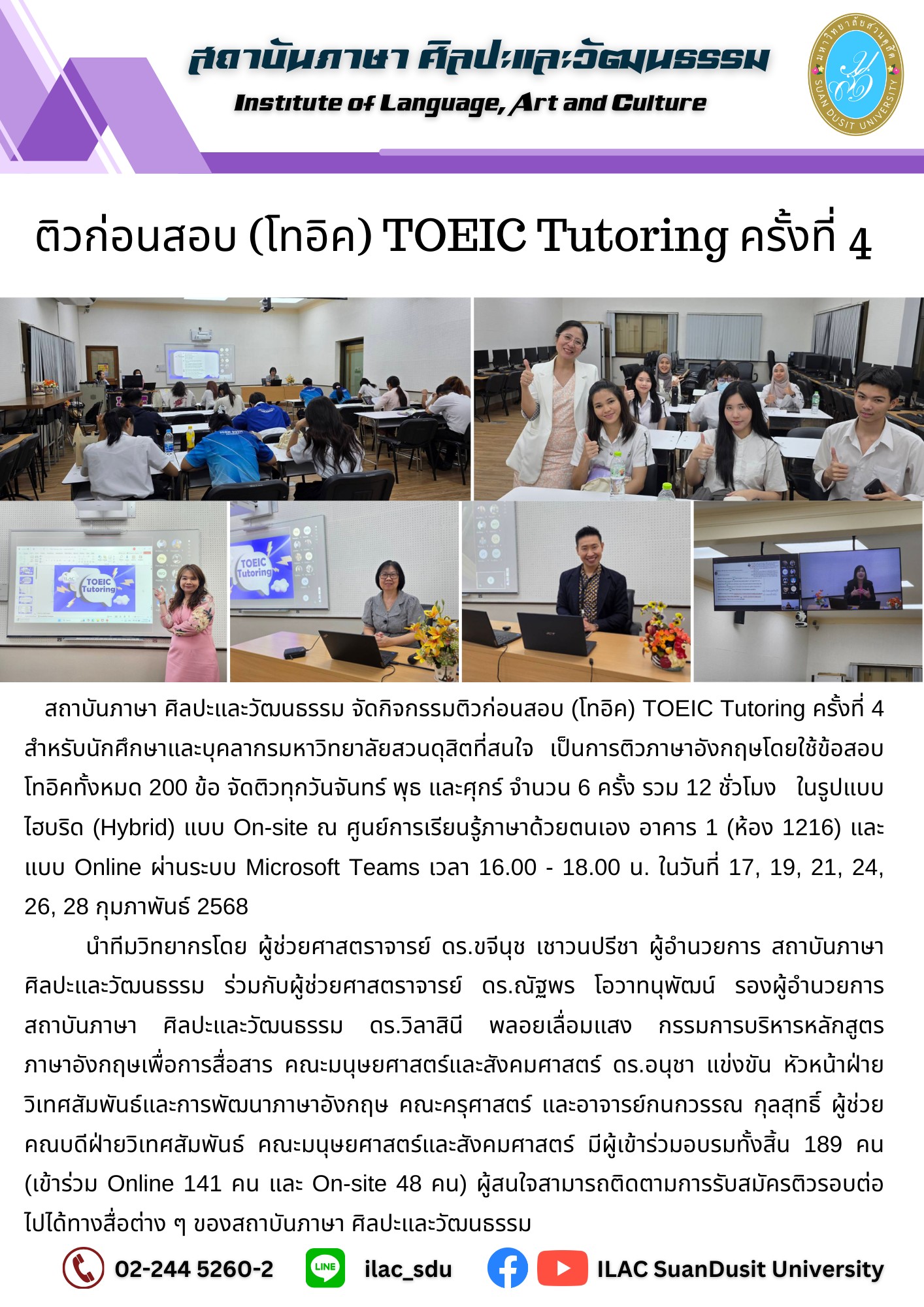 สถาบันภาษา ศิลปะและวัฒนธรรม จัดกิจกรรม “ILAC English Smart” สำหรับนักศึกษาโรงเรียนการท่องเที่ยวและการบริการ รหัส 68
