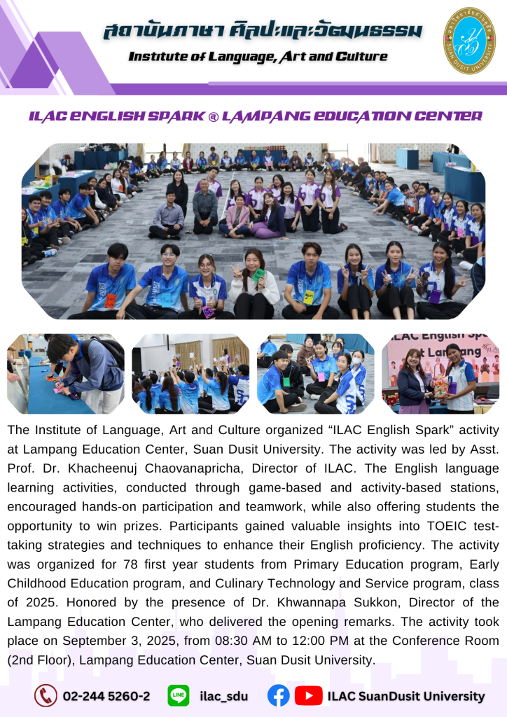 สถาบันภาษา ศิลปะและวัฒนธรรม จัดกิจกรรม “ILAC English Spark” ณ ศูนย์การศึกษาลำปาง มหาวิทยาลัยสวนดุสิต โดยผู้ช่วยศาสตราจารย์…