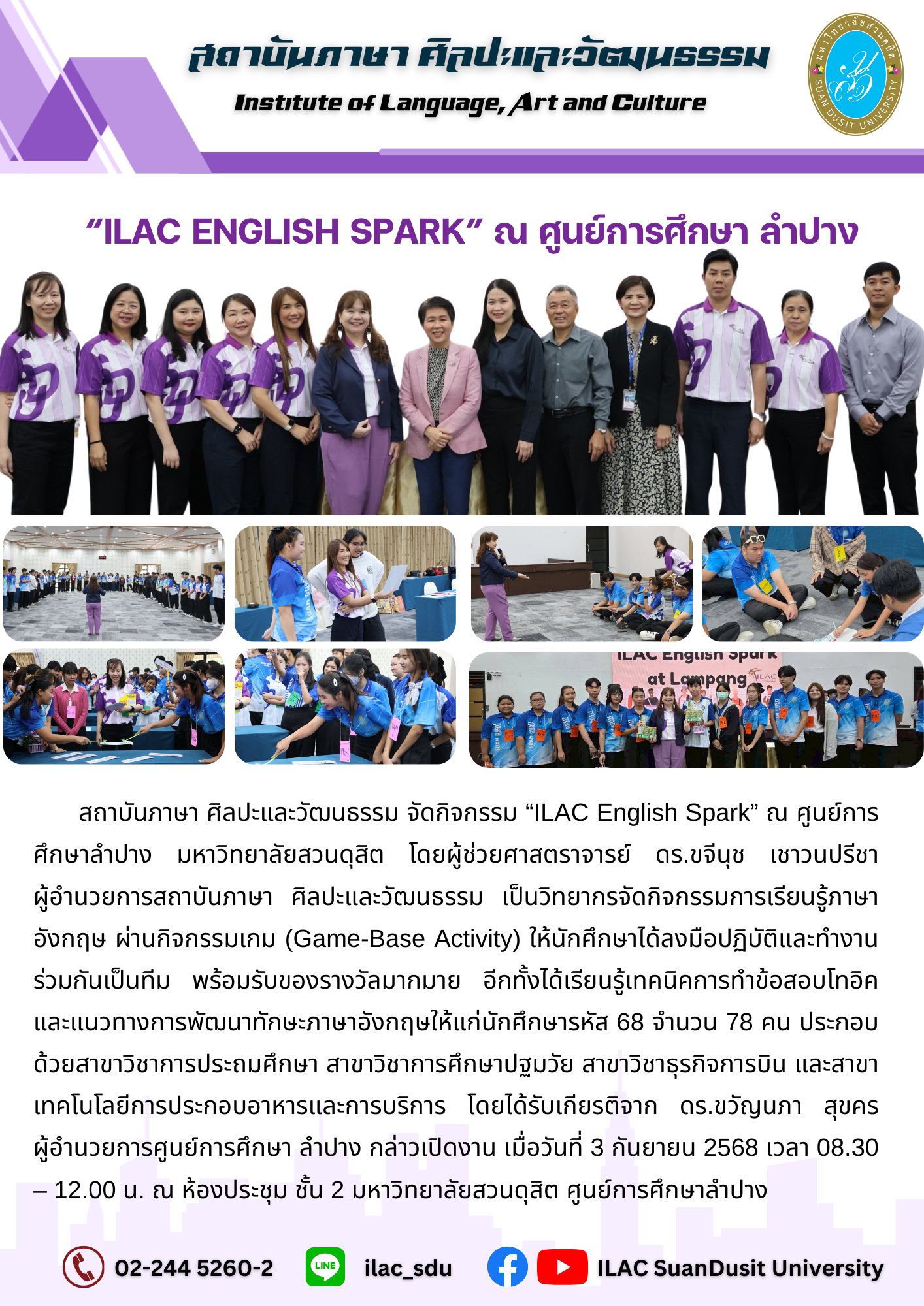 สถาบันภาษา ศิลปะและวัฒนธรรม จัดกิจกรรม “ILAC English Spark” ณ ศูนย์การศึกษาลำปาง