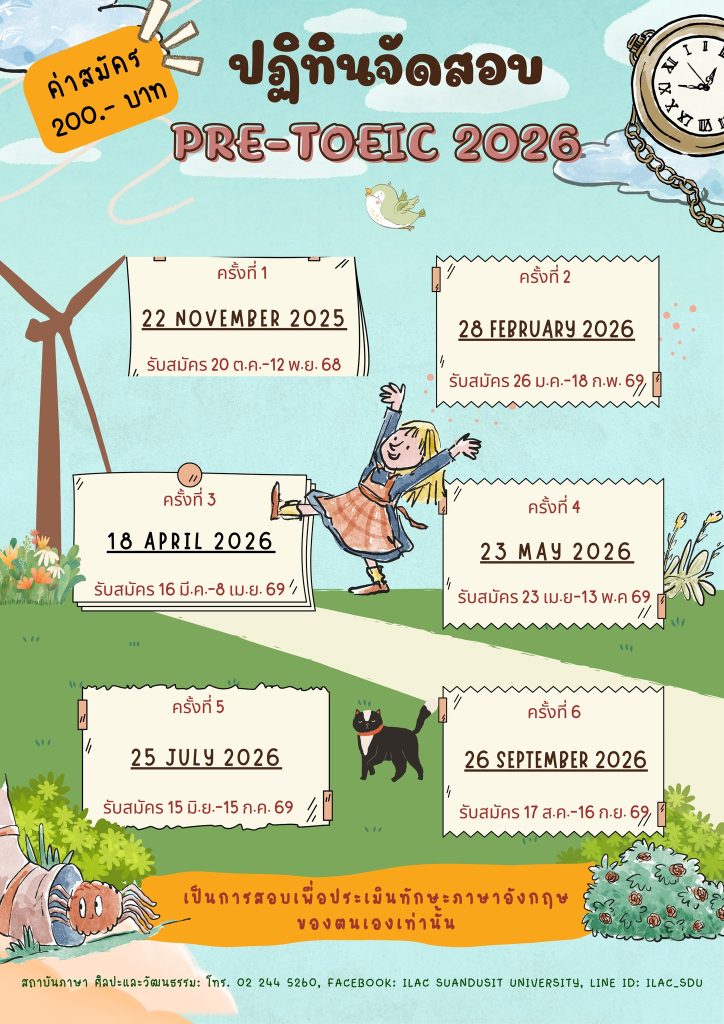 สถาบันภาษา ศิลปะและวัฒนธรรม มหาวิทยาลัยสวนดุสิต ประชาสัมพันธ์ปฏิทินการให้บริการทดสอบภาษาอังกฤษ Pre-TOEIC (สำหรับนักศึกษาและบุคลากร)